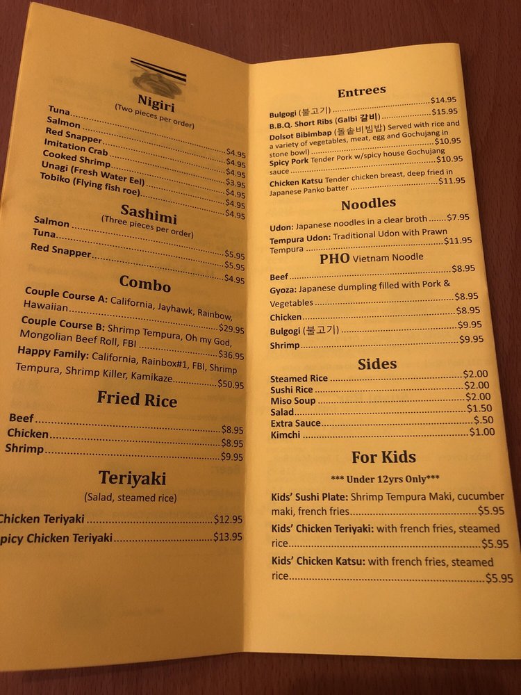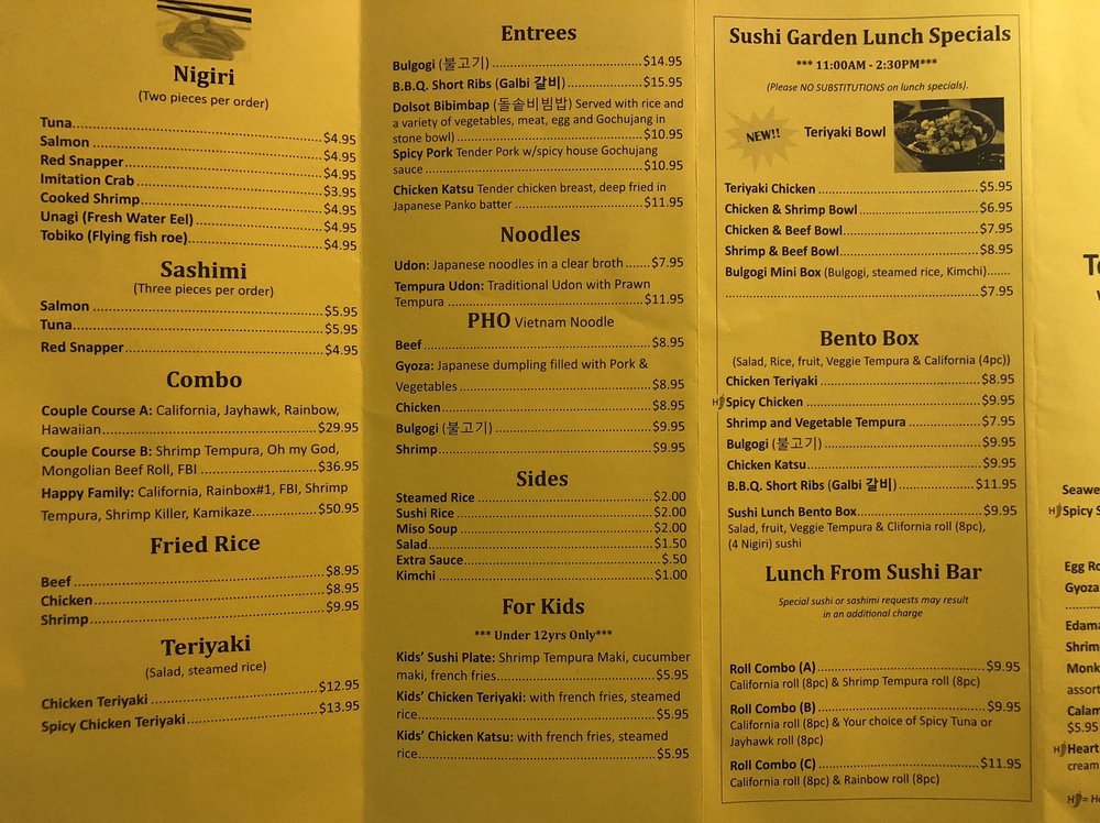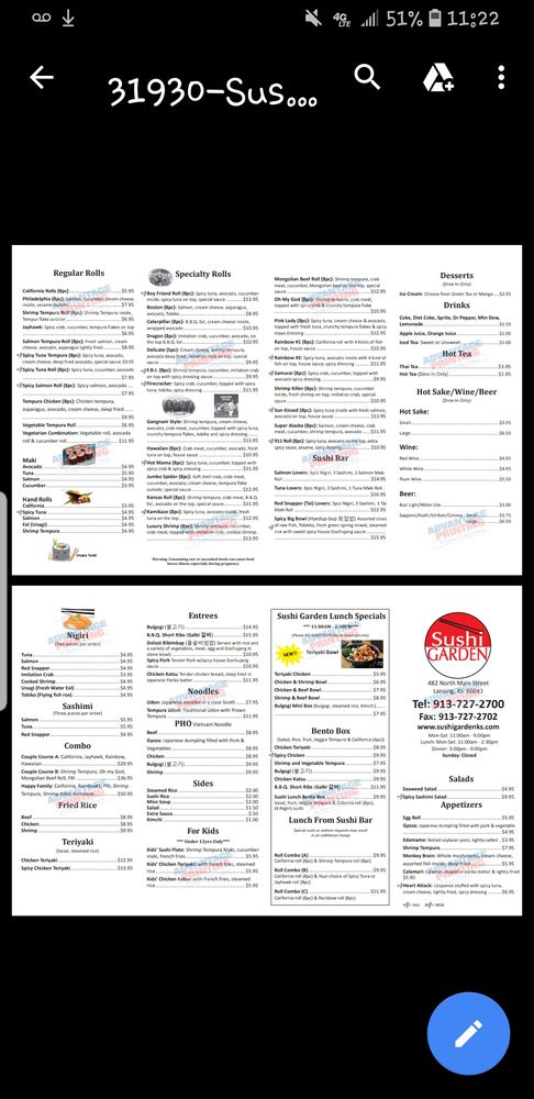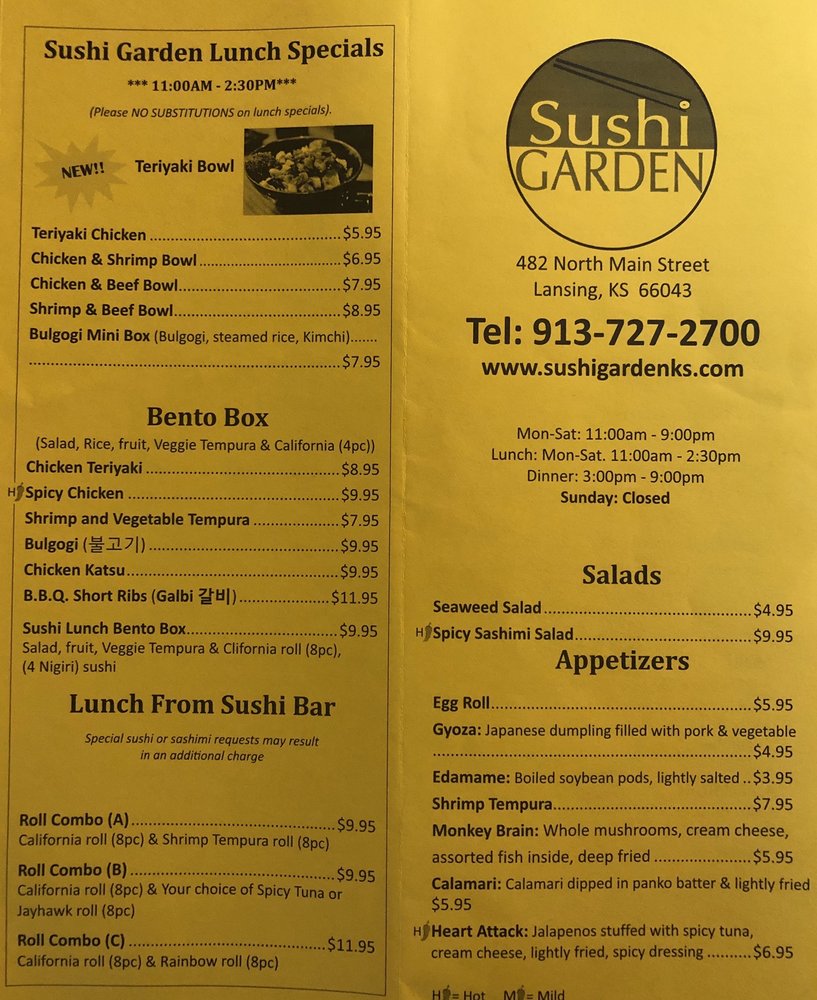 Welcome to Sushi Garden, a delightful fusion of Japanese and Korean cuisine located in Lansing, Kansas. This charming eatery offers an inviting atmosphere, perfect for casual dining with family and friends. The menu is a treasure trove of flavors, featuring hand rolls like the classic California Roll and the indulgent Salmon Tempura Roll. For heartier options, try the crispy Chicken Katsu or the comforting Udon noodles in a rich broth.